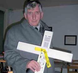Foto rechts: Dr. med. Thomas Ward mit dem Kreuz, das er am 4. Oktober in München trug (das Geschenk aus Deutschland hat noch die Aufkleber von der Sicherheitskontrolle des Münchener Flughafens). Voller Stolz brachte er es mit zum 1000-Kreuze-Gebetszug in London am 18. Oktober (Fest des Hlg. Lukas, Arzt und Evangelist), an dem über 400 Beter von